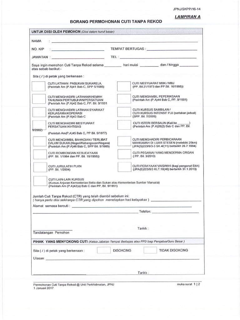 Borang Cuti Tanpa Rekod Untuk Menduduki Peperiksaan
