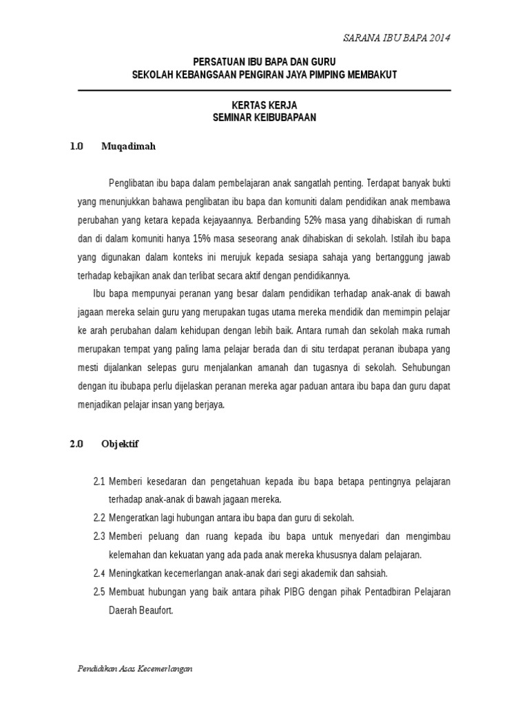 Persatuan Ibu Bapa Dan Guru Sekolah Kebangsaan Pengiran Jaya Pimping Membakut Kertas Kerja Seminar Keibubapaan 1 0 Muqadimah
