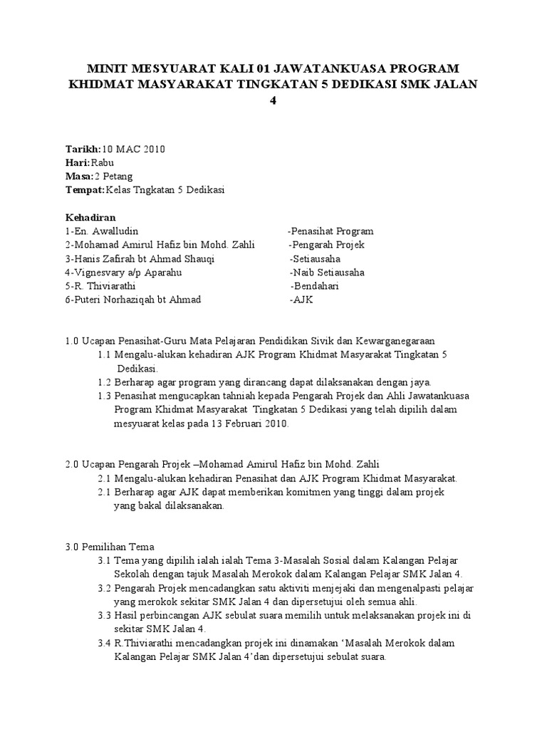 Minit Mesyuarat Kali 01 Jawatankuasa Program Khidmat Masyarakat Tingkatan 5 Dedikasi Smk Jalan 4