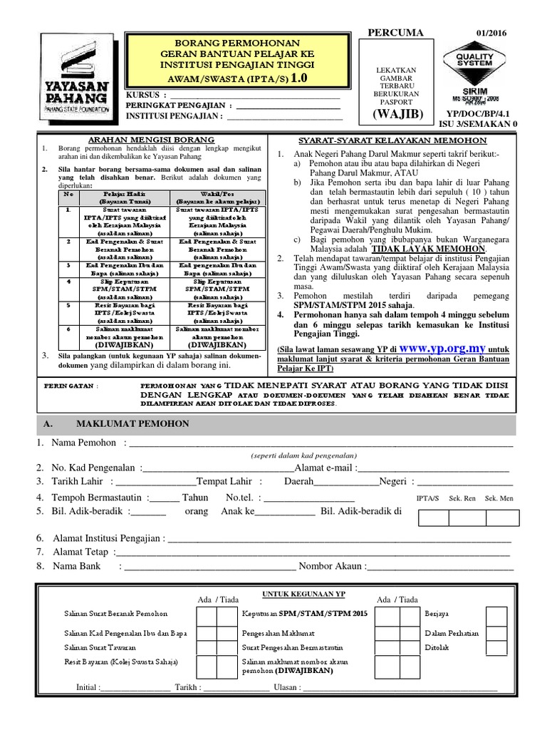 Permohonan Geran Bantuan Pelajar Ke Ipta S Bagi Tahun 2019 Yayasan Pahang Mypendidikanmalaysia Com