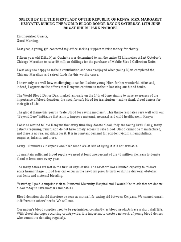 First Lady Margaret Kenyatta S Speech During The World Blood Donor Day 2014 Blood Donation Health Sciences