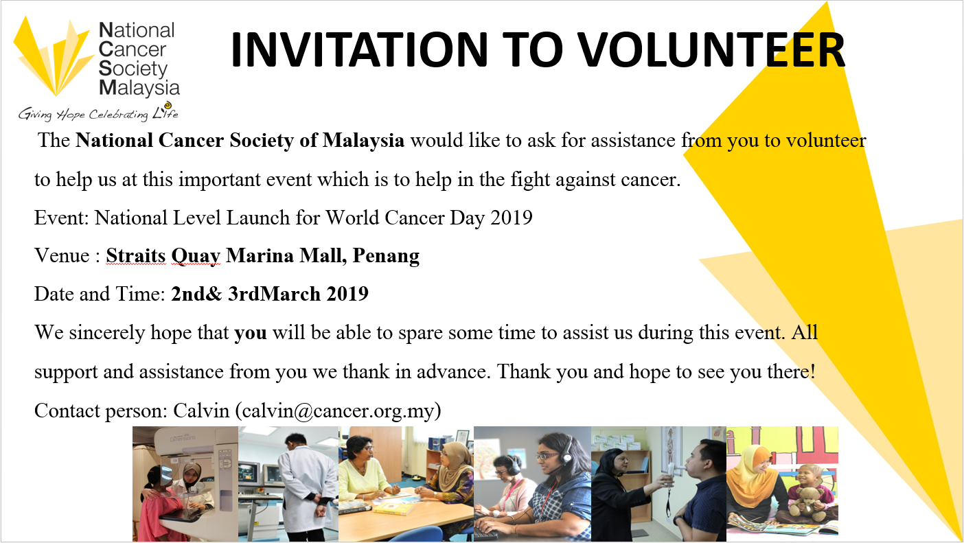 National Cancer Society Of Malaysia Penang Branch Invitation To Volunteer At World Cancer Day Event 2019