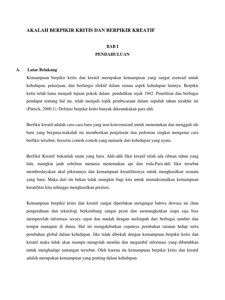 Akalah Berpikir Kritis Dan Berpikir Kreatif Bab I Pendahuluan