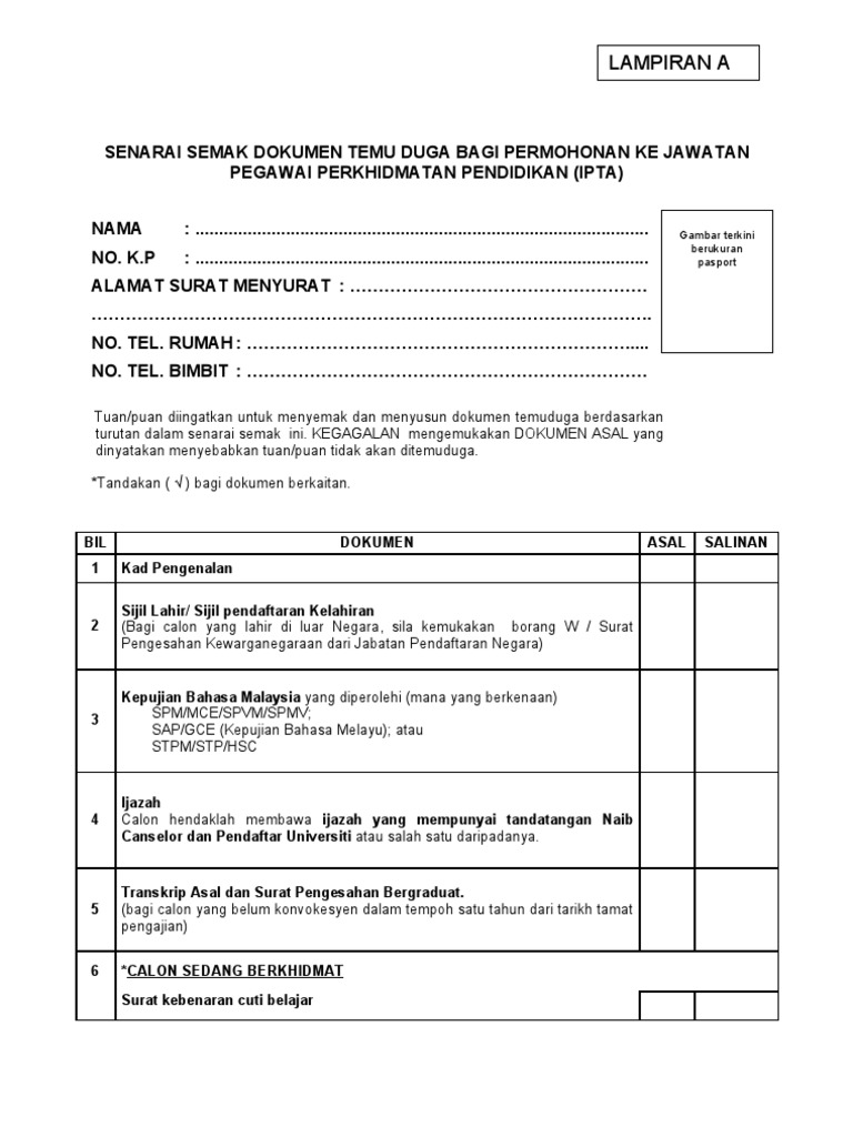 Senarai Semak Dokumen Peribadi Bagi Temuduga Spp