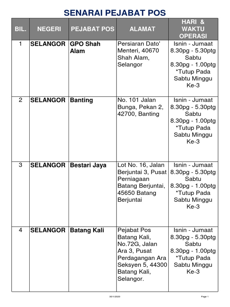Alamat Nombor Telefon Waktu Operasi Cawangan Pos Malaysia Negeri Selangor Pos Malaysia Info Online